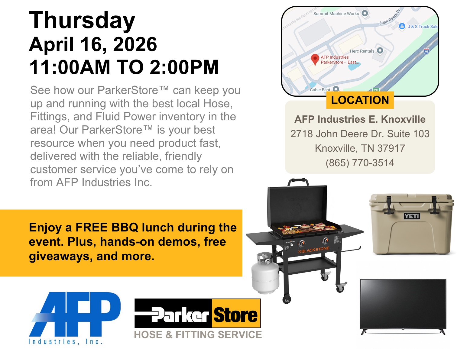 Join us on April 16, 2026 for AFP Industries’ East Knoxville ParkerStore Hose Blitz & Open House. Enjoy lunch, live demos, raffles and see how we can support your business.